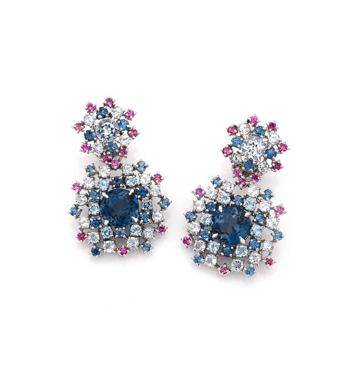 18kt white gold, 11.82ct London blue topaz, 1.9ct blue topaz, 6.2ct baby blue topaz and 1.54ct pink spinel - Earring length: 4,5cm - Earring width 2,5cm