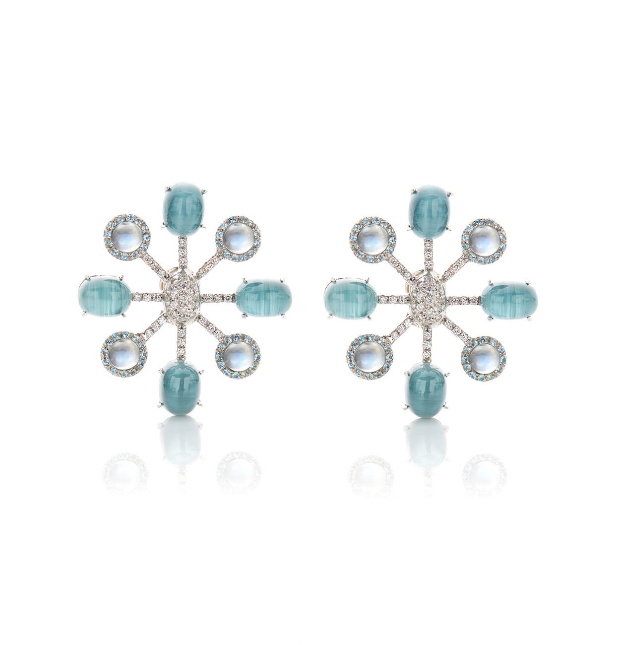 Oro bianco 18kt con tormaline Cat-eye blu 23.8ct, topazi blu 1.80ct, diamanti bianchi 0.99ct e moonstones 6ct